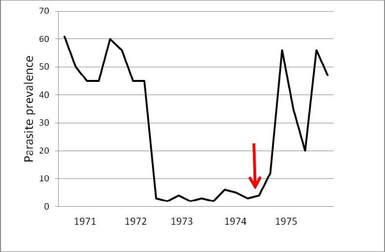 If we look back to the period when DDT was extensively used to control malaria vectors, there was a similar concern when the mosquitoes became resistant to the DDT. Sadly then, the only reaction with limited funds was to stop vector control and rely on drug treatment, but the malarial parasite became resistant to chloroquin. A recent review ( Cohen et al, 2012) shows how the incidence of malaria rapidly increased once vector control was no longer maintained. In one example in Garki, Nigeria indoor residual spraying was done with fenitrothion and propxur as alternatives to DDT but as soon as the spraying was stopped the prevalence of malaria parasites increased from <5% to around 50% (Fig. 1) (Molineux and Gramicia (1980).