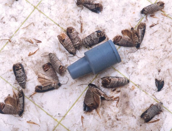 Adding acetic acid significantly increases the number caught. However, the team found that the most powerful lure resulted from combining pear ester, sex pheromone and acetic acid. The team’s studies indicated that the combined lure can capture eight to 10 times more female moths than using the pear ester-pheromone combination alone.