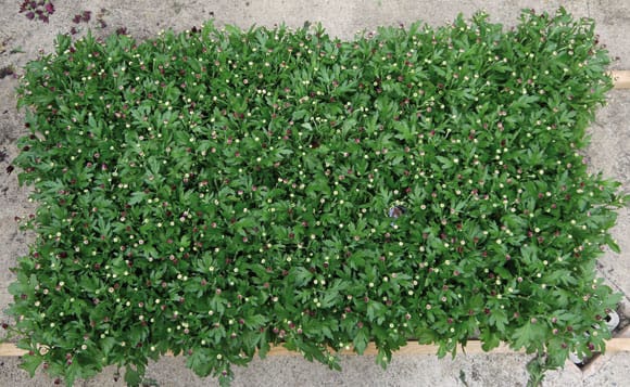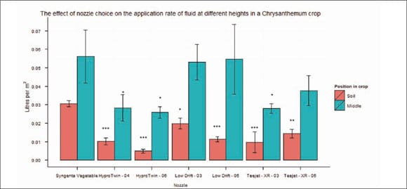 Mature 4-weeks old un-flowered potted Chrysanthemum indicum were used at a density representative of commercial conditions and spaced evenly in frames (1m x 2m) holding 32 pots, each pot containing 5 plants. The potted Chrysanthemums were randomly selected from a stock of 200 pots for use in each application. Each nozzle was tested 3 times.