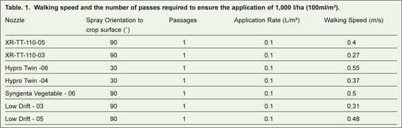 Seven boom-mounted nozzle designs (see Table 1) were trialled using three nozzles of each type mounted 50cm apart on the 1.5m boom. A motorised knapsack sprayer (Shindaiwa Motors, Ltd) connected to the end of the boom generated 3 bar pressure regulated with a constant flow valve (GATE LLC. FL, USA).