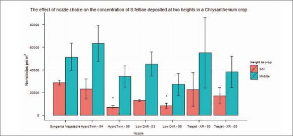 This investigation aims to determine which of a range of nozzles will apply nematodes to the soil surface most effectively and potted chrysanthemums were selected as a test plant because their dense canopy provides a high level of spray interception.