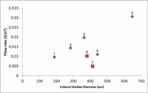 Fig. 5. The relationship between the VMD and the volume deposited at the base of each vertical spray pattern; 1. XR-TT-03, 2. XR-TT-05, 3.LD-03, 4.LD-05, 5. SV, 6.HT-04, 7.HT-06. The blue coloured points are nozzles with a vertical spray orientation. The red points are the nozzles with a 30˚ angled spray.