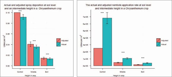 Chrysanthemum growers are recommended to apply nematodes at 1,000 l/ha ≈ 0.1 L/m² at a concentration of 2.5 x 106 nematodes/l ≈ 2.5 x105 nematodes/m². The various nozzle designs created a range of flow rates requiring individual nozzles to be calibrated and a walking speed determined to ensure the standard application rate across all nozzles. For calibration, the boom was held 50cm above a 1x1m tray and the volume applied during 60sec was recorded. A Patternator (Lurmark, Ltd) was used to check a consistent application rate across the width of the spray. A mechanical pacemaker was designed to ensure the accuracy of the walking speed for each nozzle type. Three pieces of water-sensitive paper (Teejet Ltd) were also placed randomly at the base of the crop to capture and visualise deposited droplets. The volume median diameter (VMD) of the spray droplets was measured using a droplet analyser (Malvern Instruments Ltd, Worcestershire,UK).